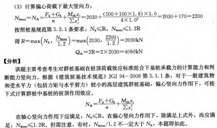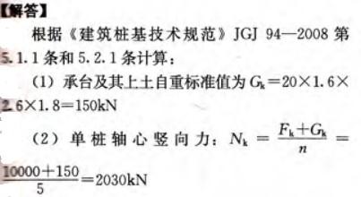 问题 假设某工程中上部结构传至承台顶面处相应于荷载效应标准组合下的竖向力Fk=10000kN、弯矩Mk=500kN?m、水平力Hk=100kN,设计承台尺寸为1.6m×2.6m,厚度为1.0m,承台及其上土平均重度为20kN/m3,桩数为5根。根据《建筑桩基技术规范》JGJ 94-2008,单桩竖向极限承载力标准值最小应为下列何值? (A)1690kN (B) 2030kN (C)4060kN (D)4800kN