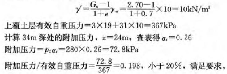 解析 【解答】 根据《岩土工程勘察规范》 GB 50021- 2001 (2005年版)第4. 1. 19条规定:地基变形计算深度,对中,低压缩性土可取附加压力等于上覆土层有效自重压力20%的深度。 采用试算法,假设钻孔深度34m,距基底深度z=34-10=24m。 计算上覆土层有效自重压力,水下部分用浮重度