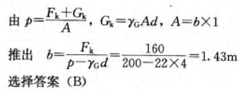 问题 多层建筑物,条形基础,基础宽度1.0m,埋深2.0m。拟增层改造,荷载增加后,相应于荷栽效应标准组合时,上部结构传至基础顶面的竖向力为160kN/m,采用加深,加宽基础方式托换,基础加深2.0m,基底持力层土质为粉砂,考虑深宽修正后持力层地基承载力特征值为200kPa,无地下水,基础及其上土的平均重度取22kN/m3。荷载增加后设计选择的合理的基础宽度为下列哪个选项? (A) 1. 4m (B) 1. 5m (C) 1. 5m (D) 1. 7m