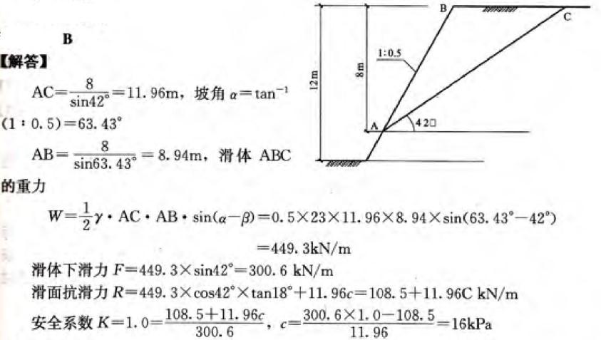 问题 图示的岩石边坡坡高12m,坡面AB坡率为1:0.5,坡顶BC水平,岩体重度γ=23kN/m3,已查出坡体内软弱夹层形成的滑面AC的倾角为β=42°,测得滑面材料饱水时的内摩擦角φ=18°。问边坡的滑动安全系数为1.0时,滑面的粘结力最接近不列哪个选项的数值? (A) 21kPa (B)16kPa (C) 25kPa (D) 12kPa