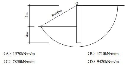 问题 —个在饱和软黏土中的重力式水泥土挡土墙如图所示,土的不排水抗剪强度cu=30kPa, 基坑深度5m,墙的埋深4m,滑动圆心在墙顶内侧O点,滑动圆弧半径R=10m。沿着图示的圆弧滑动面滑动,试问每米宽度上的整体稳定抗滑力矩最接近于下列何项数值?