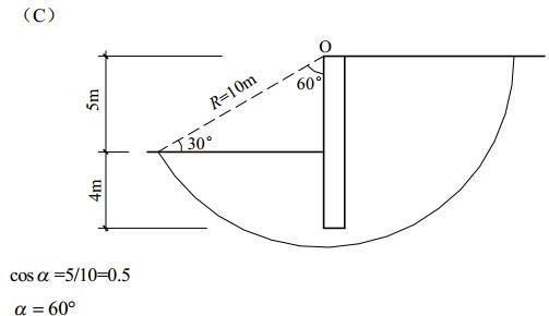 —个在饱和软黏土中的重力式水泥土挡土墙如图所示,土的不排水抗剪强度cu=30kPa, 基坑深度5m,墙的埋深4m,滑动圆心在墙顶内侧O点,滑动圆弧半径R=...