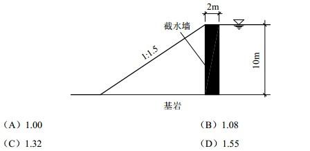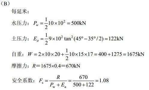 问题 拟在砂卵石地基中开挖10m深的基坑,地下水与地面齐平,坑底为基岩。拟用旋喷法形成厚度2m的截水墙,在墙内放坡开挖基坑,坡度为1:1.5。截水墙外侧砂卵石的饱和重度为19kN/m3,截水墙内侧砂卵石重度17kN/m3,内摩擦角φ=35o(水上下相同),截水墙水泥土重度为γ=20kN/m3,墙底及砂卵石土抗滑体与基岩的摩擦系数μ=0.4。试问该挡土体的抗滑稳定安全系数最接近于下列何项数值?