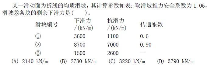 解析 据:①《面授班辅导讲义》第四十六讲。 ②《建筑地基基础设计规范》(GB 50007-2002)第6. 4. 3条。 (1)第1块的剩余下滑力F1为: F1=Fn-i φ+ γtGnt-Gnntan φ-Cn1n =Fn-i φ+ γtGnt-Rn =0+1. 05X3600-1100=2680(kN/m) (2)第2块的剩余下滑力F2为: F2=2680 X 0. 76+1. 05 X 8700-7000=4171. 8 (kN/m) (3)第3块的剩余下滑力F3为: F3=4171. 8X0. 9+1. 05 X 1500-2600=2729. 62 (kN/m) 答案为(B)。