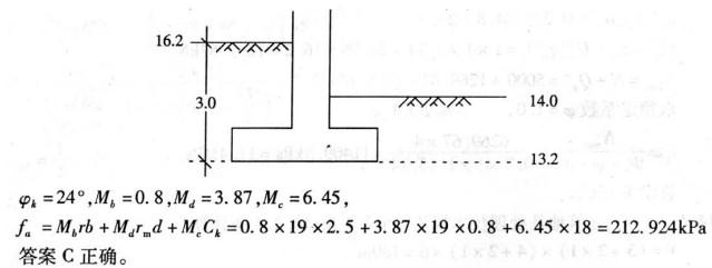 问题 某框架结构,1层地下室,室外与地下室室内地面髙程分别为16.2m和14.0m。拟采用柱下方形基础,基础宽度2.5m,基础埋深在室外地面以下3.0m。室外地面以下为厚1.2m人工填土,γ=17kN/m2;填土以下为厚7.5m的第四纪粉土,γ= 19kN/m3,Ck=18kPa。φk = 24o,场区未见地下水。根据土的抗剪强度指标确定的地基承载力特征值最接近下列哪个选项的数值? A.170kPa B.190kPa C.210kPa D. 230kPa