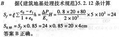 问题 场地为饱和淤泥质粘性土,厚5.0m,压缩模量为Ea为2.0MPa,重度为17.0kN/m3,淤泥质粘性土下为良好的地基土,地下水位埋深0.50m。现拟打设塑料排水板至淤泥质粘性土层底,然后分层铺设砂垫层,砂垫层厚度0.80m,重度20kN/m3,采用80kPa大面积真空预压3个月(预压时地下水位不变)。问固结度达85%时的沉降量最接近下列哪一选项? A. 15cm B.20cm C.25 cm D.10cm