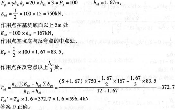 问题 在均匀砂土地基上开挖深度15m的基坑,采用间隔式排桩+单排锚杆支护,桩径1000mm,桩距1.6m,—桩一锚。锚杆距地面3m。已知该砂土的重度γ=20kN/m3,φ= 30°。无地面荷载。按照《建筑基坑支护技术规程》规定计算的锚杆水平力标准值Tel最接近于下列哪个选项? A.450kN B. 500kN C.550kN D.600kN