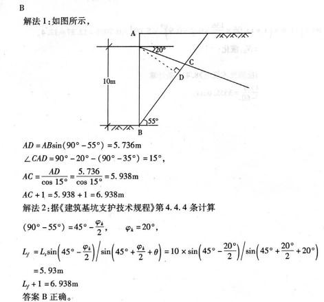 问题 有一岩体边坡,要求垂直开挖。已知岩体有一个最不利的结构面为顺坡方向,与水平方向夹角为55°,岩体有可能沿此向下滑动,现拟采用预应力锚索进行加固,锚索与水平方向的下倾夹角为20°。问在距坡底10m高处的锚索的自由段设计长度应考虑不小于下列哪个选项(注:锚索自由段应超深伸入滑动面以下不小于1m)? A.5m B.7m C. 8m D. 9m