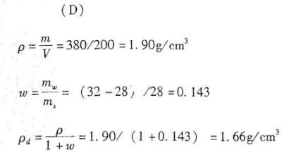 现场取环刀试样测定土的干密度。环刀容积200cm3,测得环刀内湿土质量380g。从环刀内取湿土32g,烘干后干土质量为28g。土的干密度最接近下列哪个选项...