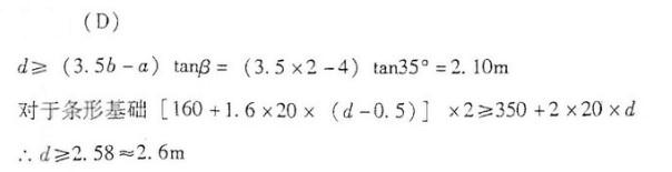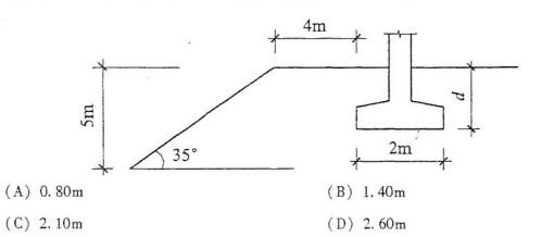 问题 某天然稳定土坡,坡角35o,坡高5m,坡体土质均匀,无地下水,土层的孔隙比e和液性指数IL均小于0.85,γ= 20kN/m3、fak=160kPa,坡顶部位拟建工业厂房,采用条形基础,上部结构传至基础顶面的竖向力(Fk)为350kN/m,基础宽度2m。按照厂区整体规划,基础底面边缘距离坡顶为4m。条形基础的埋深至少应达到以下哪个选项的埋深值才能满足要求?(基础结构及其上土的平均重度按20kN/m3考虑)