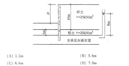 问题 一个采用地下连续墙支护的基坑的土层分布情况如图所示:砂土与粘土的天然重度都是 20kN/m3。砂层厚10m,粘土隔水层厚1m,在粘土隔水层以下砾石层中有承压水,承压水头8m。没有采用降水措施,为了保证抗突涌的渗透稳定安全系数不小于1.1,该基坑的最大开挖深度H不能超过下列哪一选项?