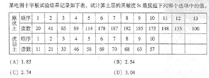 解析 (C) 由试验点的峰值确定十字板试验强度,灵敏度为原状土强度和扰动土强度之比。也即试验点的峰值之比。 Sk = 192/70 =2. 74