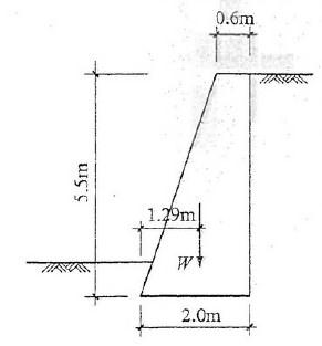 某重力式挡土墙墙高5.5m,墙体单位长度自重W = 164.5kN/m,作用点距墙前趾x=1.29m,底宽20m,墙背垂直光滑,墙后填土表面水平,填土重度...