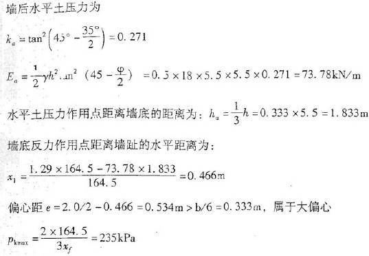 问题 某重力式挡土墙墙高5.5m,墙体单位长度自重W = 164.5kN/m,作用点距墙前趾x=1.29m,底宽20m,墙背垂直光滑,墙后填土表面水平,填土重度为18kN/m3,粘聚力c=0kPa,内摩擦角φ=35°,设墙基为条形基础,不计墙前埋深段的被动抗力,墙底面最大压力最接近下列哪一个选项? (A) 82. 25kPa (B) 165kPa (C) 235kPa (D) 350kPa
