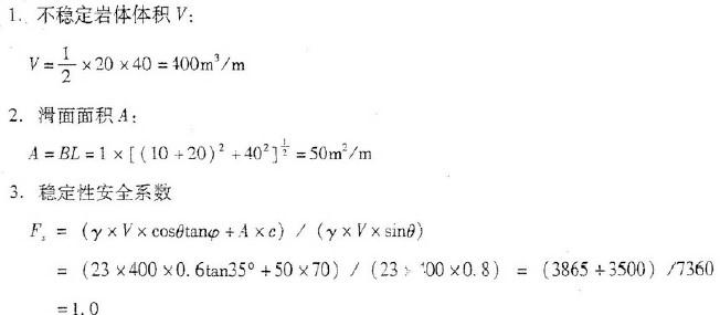 某很长的岩质边坡受一组节理控制,节理走向与边坡走向平行,地表出露线距边坡顶边緣线20m,坡顶水平,节理面与坡面交线和坡顶的高差为40m,与坡顶的水平距离1...