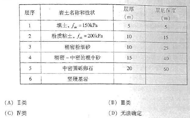 问题 某建筑场地土层分布如下表示,所拟建8层建筑,高25m,根据《建筑抗震规范》 (GB50011- 2001),该建筑抗震设防类别为丙类。现无实测剪切波速,该建筑诙建场地的类别划分可根据经验按下列哪一选项考虑?