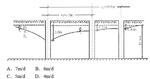 某工程场地有一厚11.5m砂土含水层,其下为基岩,为测砂土的渗透系数打一钻孔到基岩顶面,并以1.5X103cm3/s的流量从孔中抽水,距抽水孔4.5m和1...