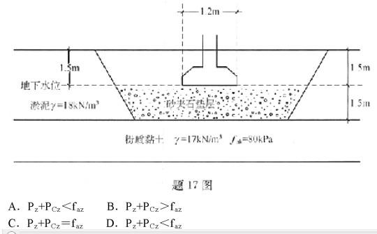 问题 某钢筋混凝土条形基础埋深d=1.5m,基础宽b=1.2m,传至基础底面的竖向荷载Kk+Gk=180kN/m(荷载效应标准组合),土层分布如图,用砂夹石将地基中淤泥土全部换填,按《建筑地基处理技术规范》(JGJ79—2002)验算,下卧层承载力属于下述()种情况。(垫层材料重度γ=19kN/m3)