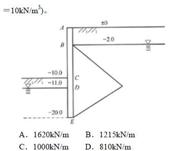 问题 某基坑剖面如图所示,按水土分算原则并假定地下水为稳定渗流,正点处内外两侧水压力相等,问墙身内外水压力抵消后作用于每米支护结构的总水压力(按图中三角形分布计算)净值应等于()(Y w