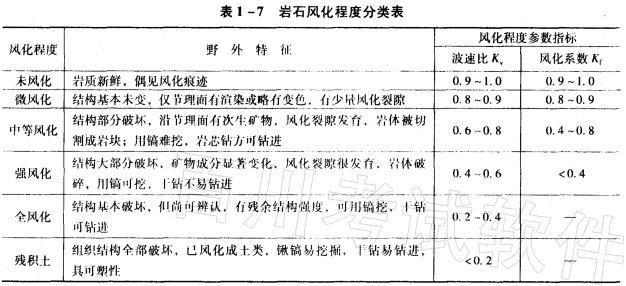 解析 根据《岩土工程勘察规范》(GB 50011-2001)(2009年版)附录A中的岩石风化程度分类表(见表1-7),波速比Kv为风化岩石与新鲜岩石压缩波速比,Kv=3000/3500 =0. 86;风化系数Kf为风化岩石与新鲜岩石饱和单轴抗压强度之比,Kf = 17/ 20=0. 85;故可以判定,岩体的风化等级为微风化。