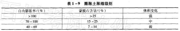 解析 根据《膨胀土地K建筑技术规范》(GBJ112—1987)第2. 3. 2条,规定,当自由膨胀率大于40%时,可判定为膨胀土,特殊情况下尚可根据蒙脱石百分含量确定,当蒙脱石含量大于7%时,亦可判定为膨胀土,具体如表1-9所示。