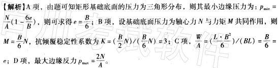 问题 已知矩形基础底面的压力分布为三角形,最大边缘压力为Pmax,最小边缘压力为零,基础的宽度为B,长度为L,基础底面积为A,抵抗矩为W,传至基础底面的竖向力为N。下列的表述中符合上述基础底面压力分布特征的正确说法( )。