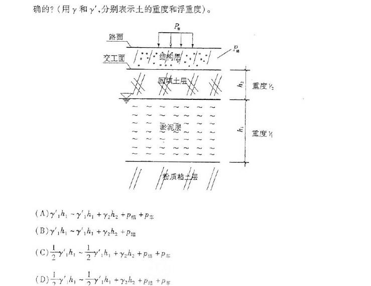某道路地基剖面如图所示,其中淤泥层厚度为h1,淤泥层顶面至交工面回填土厚度为h2,交工面至路面的结构层荷载为p结,道路使用时,辆动荷载为p车,地下水位在淤...