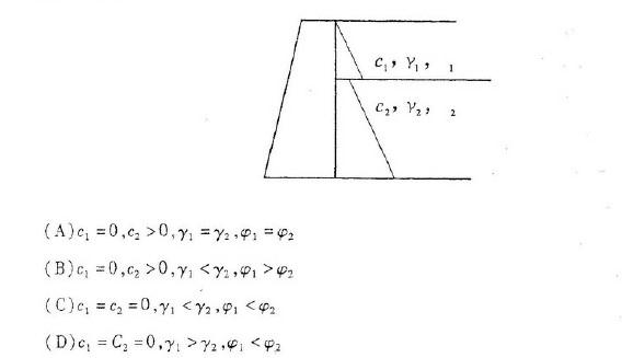 有一墙背光滑、垂直,填土内无地下水,表面水平,无地固荷载的挡土墙,墙后为两层不同的填土,计算得到的主动土压力强度分布为两段平行的直线。如图示,下列哪些选项...