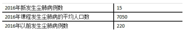 问题 2016年某市有关部门对接触性粉尘可能造成职业危害的5682人进行职业健康查体,对尘肺病患病情况进行了执业卫生调查统计,资料数据如下表。 (说明:以上统计数字截止到2016年12月31日) 至2016年12月31日,该市尘肺病患病率为()。