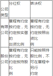 解析 《公司法》第一百六十六条:“……公司弥补亏损和提取公积金后所余税后利润,有限责任公司依照本法第三十四条的规定分配;股份有限公司按照股东持有的股份比例分配,但股份有限公司章程规定不按持股比例分配的除外。……” 《公司法》第三十四条:“股东按照实缴的出资比例分取红利:公司新增资本时,股东有权优先按照实缴的出资比例认缴出资。但是,全体股东约定不按照出资比例分取红利或者不按照出资比例优先认缴出资的除外。” 因此,关于股东分红权,不管是有限公司还是股份公司,章程有约定则按照约定来,没约定,则有限公司按照实缴的出资比例分取红利,股份公司按照股东持有的股份比例分配。 【链接】公司法关于股东表决权的规定 (1)有限公司 《公司法》第四十二条:“股东会会议由股东按照出资比例行使表决权;但是,公司童程另有规定的除外。” (2)股份公司 《公司法》第一百零三条:“股东出席股东大会会议,所持每一股份有一表决权。……” 因此,关于股东表决权,有限公司是章程有约定按照约定,无约定则按照出资比例行使表决权;股份公司则只能按照持股比例行使表决权,不可在章程中另行约定。 【总结】关于分红权与表决权的总结