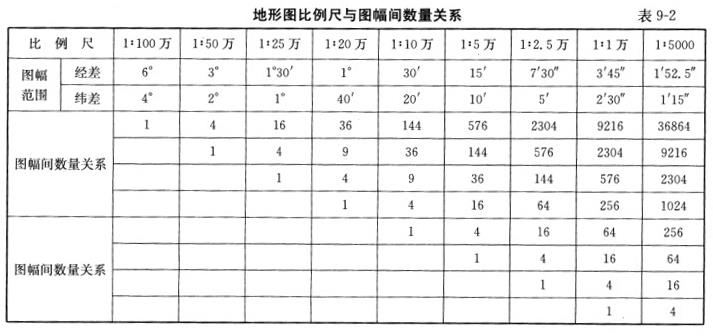 解析 熟记常用的1:100万、1:10万分幅的经、纬差。一幅1:100万地形图包含12行12列的1:10万地形图;一幅1:10万地形图包含8行8列的1:1万地形图。不同比例尺的图幅数量关系如表9-2所示。
