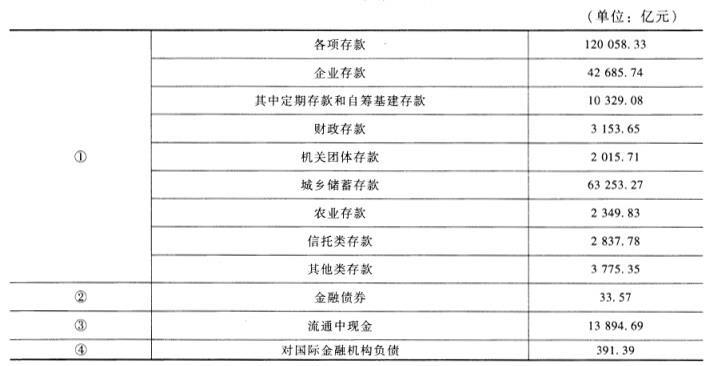 解析 M1=企业存款-其中定期存款和自筹基建存款+机关团体存款+农业存款+流通中现金=42685.74-10329.08+2015.71+2349.83+13894.69=50616.89(亿元)。 M2=M1+城乡居民储蓄存款+企业存款中具有定期性质的存款+信托类存款+其他类存款=50616.89+63253.27+10329.08+2837.78+3775.35=130812.37(亿元)。 M3=M2+金融债券+商业票据+大额可转让定期存单等。 M0/sub>和M1流动性最强,是最容易转化为现实流通工具的货币,即狭义货币;M2、M3,即除现金、活期存款外,将银行机构的各种定期存款、储蓄存款和一批易于变现的短期信用工具包括在内的货币形式,即广义货币。
