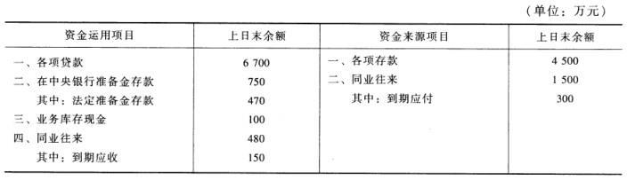问题 共用题干 某商业银行资料如下表所示。 假设该行超额准备金留存限额为100万元;业务库存现金限额40万元;可调入资金300万元;现金收入超过现金支出的差额25万元;联行应付大于应收的汇差为50万元;同城票据清算应收资金15万元;到期的其他金融机构拆入差额38万元;发放贷款100万元;收回贷款60万元(其中本行客户30万元)。根据以上资料,回答下列问题。
