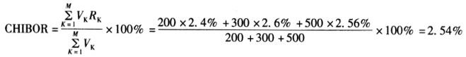 问题 某日全国银行间同业拆借市场中期限品种为7天的交易共3笔,其中拆借金额分别为200万、300万、500万,拆借利率分别为2.4%、2.6%、2.56%,则CHIBOR为()。