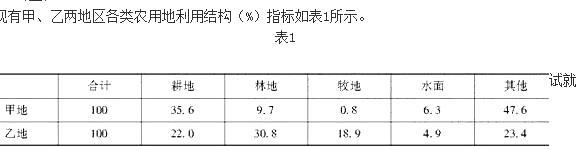 问题 现有甲、乙两地区各类农用地利用结构(%)指标如表1所示。 试就有关两地区农业生产结构的问题作出正确选择。 题中资料表明(  )。
