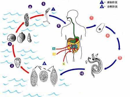 如图所示,当人畜接触血吸虫疫水后,能侵入体内的是 ( )A.子胞蚴B.母胞蚴C.尾蚴D.毛蚴E.童虫