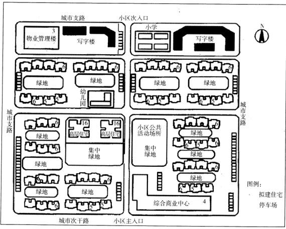 北方某居住小区规划方案如图4所示,开发公司将其定位为高档住宅小区,户型面积为12 0m2、1 5 0 m2、1 70m2三种类型,试评析其规划设计方案优缺...