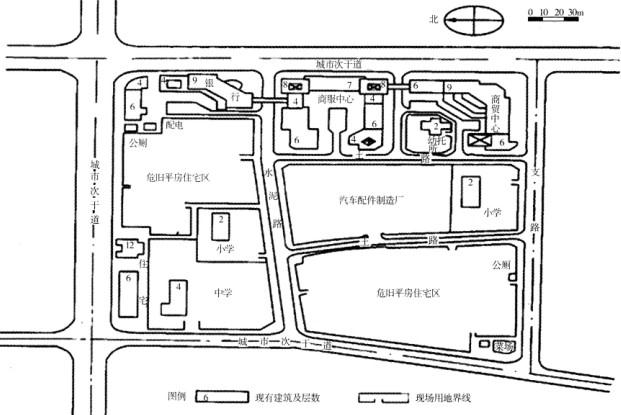 问题 某城市小区,三面临城市次干道,其南侧为支路。总用地面积为14.5 hm2。现状市政管线已埋入道路地下,已建配电房能满足小区改建后的要求。该用地东侧已建成金融、商业服务中心,小区西北角有两栋新建住宅楼和一所中学;另有两所小学和一处托幼所,以及两片危旧平房住宅区和一处汽车配件铸造厂。现已决定将此小区列为危改居住小区进行统一规划。 【问题】 试根据现状条件(如图4)及一般危改居住小区的规划设计要求,提出需要调整和增加的主要内容。