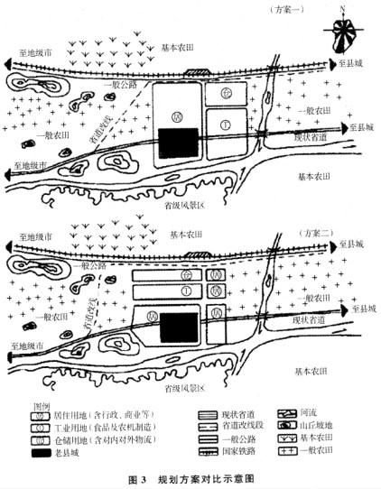 如图所示为某县级城市用地发展布局及省道改线的两个规划方案。值得注意的是该城市西距人口6 5万的地级城市40km,东距5万人口的县城30km。用地条件较好,...