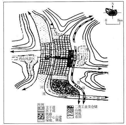 解析 (1)优点如下: ①主、次干道布置顺应了山势及河流走向。 ②沿东西向城市中心大道布置城市中心公共建筑有利于组织城市特色,东为西山风,区,南为客站。 ③工业、仓库用地区位合理,对外交通方便,靠近货站。 (2)缺点如下: ①沿铁路西侧的南北向城市道路承担过境交通功能,两侧布置了市中心公建,影响了交通功能的发挥.道路功能混乱。 ②工业、仓库区内部没有规划道路系统,与城市其他用地缺少联系。 【解析】 从城市干道网的布置方面着手去分析,分为两个方面:与地形地貌的关系,与城市建设用地的关系。与地形地貌的关系:从图上看,有山、有河流,山的范围和坡度以等高线来表现。干道网的布置密切结合山势和河流的走向,这在城市建设中是经济的,是一个明显的优点. 与城市建设用地的关系:图中的城市建没用地包括市中心公建、二类工业及仓储、绿地、林地等.那么我们可以从这几个内容上着手分析。城市中心公建沿东西向的城市中心大道布置“西山风景区”在西向.一大块绿地、林地在东向,可以形成对景,有利于组织城市景观.但是,沿铁路客站西侧的南北向城市主干道两侧布置了大量城市中心公建,就在功能上存在问题。 道路由性质、位置、红线宽度等,分为交通型、商业服务型、行政服务型等不同种类,这条主干道穿越城市,与铁路的方向平行,而且南、北两个方向上都画有箭头,说明这是城市一条主要的与外界联系的道路,承担过境交通,应属典型的交通型道路,一般情况下这种道路的车速较快.如果在两侧布置大量公建,产生大量人流,对交通安全将构成威胁.影响城市交通性主干道功能的发挥。而且大量的、快速的过境,交通也妨碍繁荣的商业环境的形成。比如北京的平安大街,在拓宽路面、使车流能够快速通过之后,道路两侧原本繁华的商业环境反而不振。有一得便有一失,城市规划是一个系统的、不断的决策过程,如果在这个过程中能够就可能产生的问题进行充分的论证,我们至少可以综合考虑、权衡利弊,少走弯路,使城市尽量朝着理想的、可持续的方向发展。从工业仓储区的位置来看,处于城市河流的下游,比较合理;东侧紧邻过境交通的干道,附近设置了铁路货站,对外交通方便。但是工业仓储区与城市其他用地之间绿化隔离带范围过大,中间缺少联系道路。另外,在总体规划阶段必须安排的主、次干道系统在工业仓储区也没有体现,可以说规划深度不够。从绿地、林地的布置来看,沿主要干道和河流之间布置带状绿地,有利于创造良好的城市环境和景观。经过上面的充分分析,我们可以把城市干道网布置涉及的市中心公建、二类工业及仓储、绿地、林地等几个方面的规划内容,按题目要求把优、缺点分别归纳出来,就得到了本题的答案。