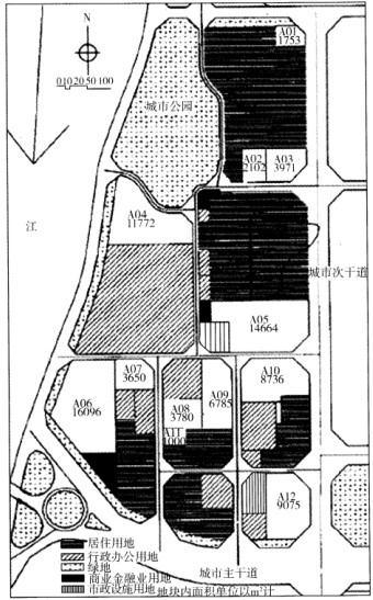 解析 (1)机关幼儿园(8班):A03。 (2)小学(24班):A05 。 (3)机关门诊所:A08。 (4)社会停车场(300辆车):A10。 (5)广播电视台(1hm2以上):A04。 (6)政府招待所(1 hm2以上):A06 。 【解析】 8班幼儿园属中型幼儿园,用地面积在3000~4000m2左右,而且用地位置以邻近主要居住区为宜。A03、A07、A08三块地的面积比较合适,但是A07、A08主要邻近行政办公用地,因此仅有A03比较合适。2 4班小学用地应包括建筑用地、运动场地、绿化用地,用地面积在1~1.5hm2之间为宜,A04、A05、A06的面积都可以,但作为小学用地,A05的位置适中,服务半径更加合理。 机关门诊所的位置有A07、A08两块邻近行政办公用地的地块可以选择,但是A07位于路口处,环境嘈杂,过往车流多,与门诊本身的人流、车流容易形成混杂。因此A08比较合适。 社会停车场,一般地,用小型机动车停车面积来计算,每车面积为2 5 m2左右,题目要求停车量为300辆车,需要8000m2左右,A10比较合适;A12的面积也接近这个数字,但是A12的位置处在城市主干道与城市次干道的交叉口处,进出停车场车辆与干道上行驶的大量车辆互相干扰,因此A12不合适。广播电视台用地要求1hm2以上,A04、A06都符合要求,但是A06紧邻居住用地,广播电视台中需要设置电子发射装置,要求与居住建筑有一定的距离,因此只有A04比较合适。政府招待所(1 hm2以上)仅余下A06比较合适。