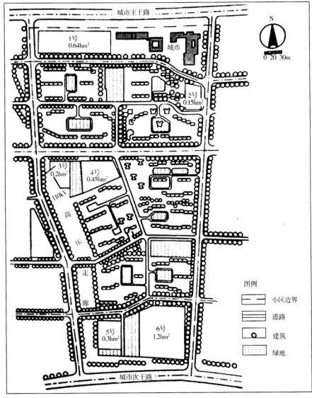 问题 某市在市区内拟建一个居住小区。规划方案将该小区确定为集中建设多层住宅。小区内规划公共建筑设施比较齐全,交通方便。小区南北分别为城市主次干道,西侧有110kV的高压走廊,东邻居住用地,北边尚有空地。小区总用地2 1 hm2,规划总建筑面积29.4万m2。不意图2中除居住组团外,尚需要布置的小区公共建筑有:小学1所,托幼2所(其中一所8个班,一所6个班)、工业企业办公楼1栋以及小区变电所。 【问题】 请你在小区内留有的6块空地(图)中选择合适地块,布置上述5项设施(用文字叙述某地块布置某项目即可)。