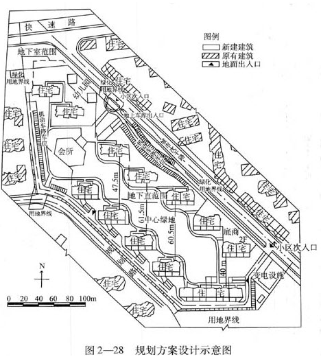 图2-28及表2-28为北方一城市某房地产商通过土地出让方式所获得的住宅商品房建设用地,该用地北邻城市快速路,东、南与西侧均为现状居住用地。其中《土地出让合同》所规定的土地使用条件如下: