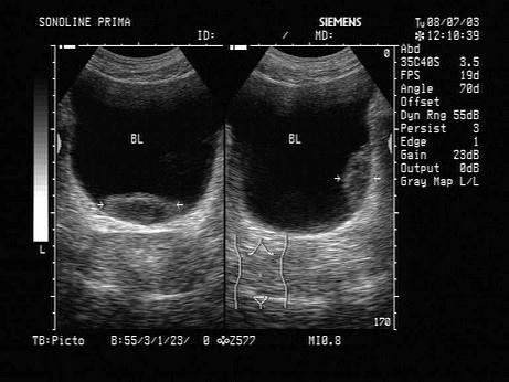 根据超声图像,该病例最可能诊断为?(?)A.膀胱结石B.膀胱血块C.膀胱异物D.膀胱肿瘤E.腺性膀胱炎