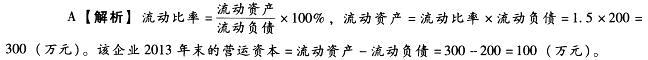 问题 甲公司2013年末负债总额为350万元(其中流动负债200万元),资产总额为850万元,流动比率为1.5,年经营现金流量净额为60万元,年税后利息费用为20万元,净利润为120万元,所得税为40万元。 该企业2013年末的营运资本为( )万元。