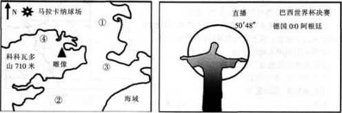问题 北京时间2014年7月14日3点20分世界杯决赛在里约热内卢(2257′S,4312′W)的球场正式开始,直播期间电视台播放雕像(位于山顶,高30米)拥抱太阳画面成功抢镜(左下图为地理位置示意图,右下图为直播画面),据此回答4~5题。 图中直升飞机航拍的可能拍摄地点是( )。查看材料
