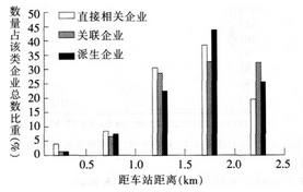 选项 A.直接相关企业数量占该类企业总数比重,在距离车站0.5 km~1.0 km圈层中最小 B.关联企业在各圈层中的数量,以1.0 km~1.5 km圈层中最少 C.派生企业在各圈层中的数量,由内圈到外圈先增后减 D.各圈层中三类企业的数量之和,由内圈向外圈依次减少