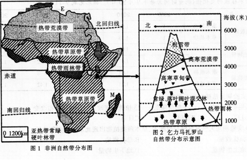 问题 材料非洲的自然带景观分布是地带性和非地带性综合作用的结果。乞力马扎罗山素有“非洲屋脊”之称。而许多地理学家称它为“非洲之王”。读图回答下列问题。 (1)根据图1归纳非洲自然带的分布特征,并分析E-F沿线光照和水分变化状况。(6分) (2)根据图1分析M岛自然带差异的原因。(6分) (3)图2所示,比较乞力马扎罗山南:11s坡雪线的高低差异,并分析造成上述差异的原因。(4分)