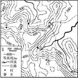 解析 “坪”指山区中局部的平地。平地地势起伏小,在地形图上表现为等高线稀疏,图中4个村中,④村附近等高线稀疏,说明地势较平坦。故选A。