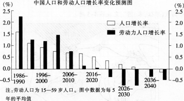 解析 人口增长率为正值时,其人口总量将不断增加,当人口增长率为零时,则该国人口总量将不在增加,其人口总量达到最大值。从图中信息可知,在2036—2040年期间,我国人口增长率为零,则我国人口总量达到最大值。在2035年以前,我国人口增长率大于零,人口总量不断增加。